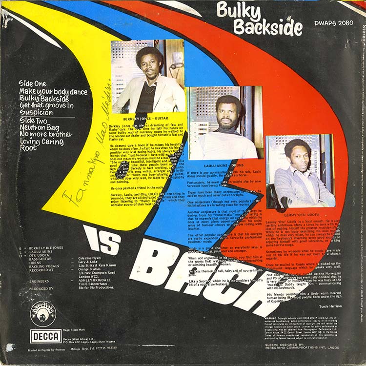 ナイジェリア産モダンソウル「B1. Neutron Bag」、「B2. No More Brother」、サイケアフロファンク「B4. Roots」など極上。ナイジェリア、ラゴスで結成された3人組バンド、Bloの1979年の傑作。ほどよく漂うサイケフィーリングとアフロエッセンス、欧米のファンクミュージックがミックスされたサウンドが気持ち良い。トリッキーなシンセが気持ち良いディスコファンク「A2. Bulky Backside」、同系の「A3. Bulky Backside」、「A4. Suspicion」もイイ。