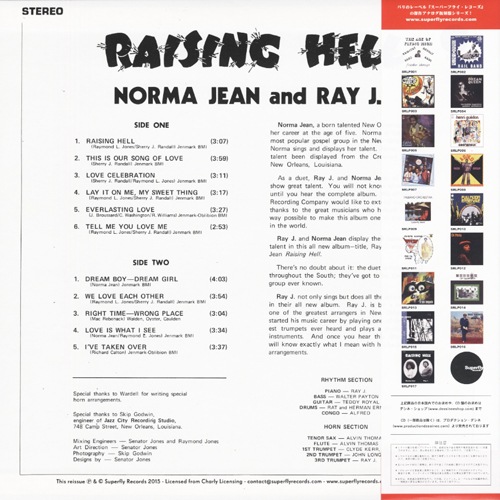 ニューオーリンズ出身の女性黒人シンガー、ノーマ・ジーンと、同じくニューオーリンズ出身の鍵盤奏者のレイ・ジェイことレイモンド・ジョーンズが1974年にニューオーリンズのローカルレーベル『HEP-ME』にも残していた幻の傑作。よりによってその内容が、どこに針を落としても素晴らしい極上のメロウ&ファンキーソウル揃いだからたまりません。