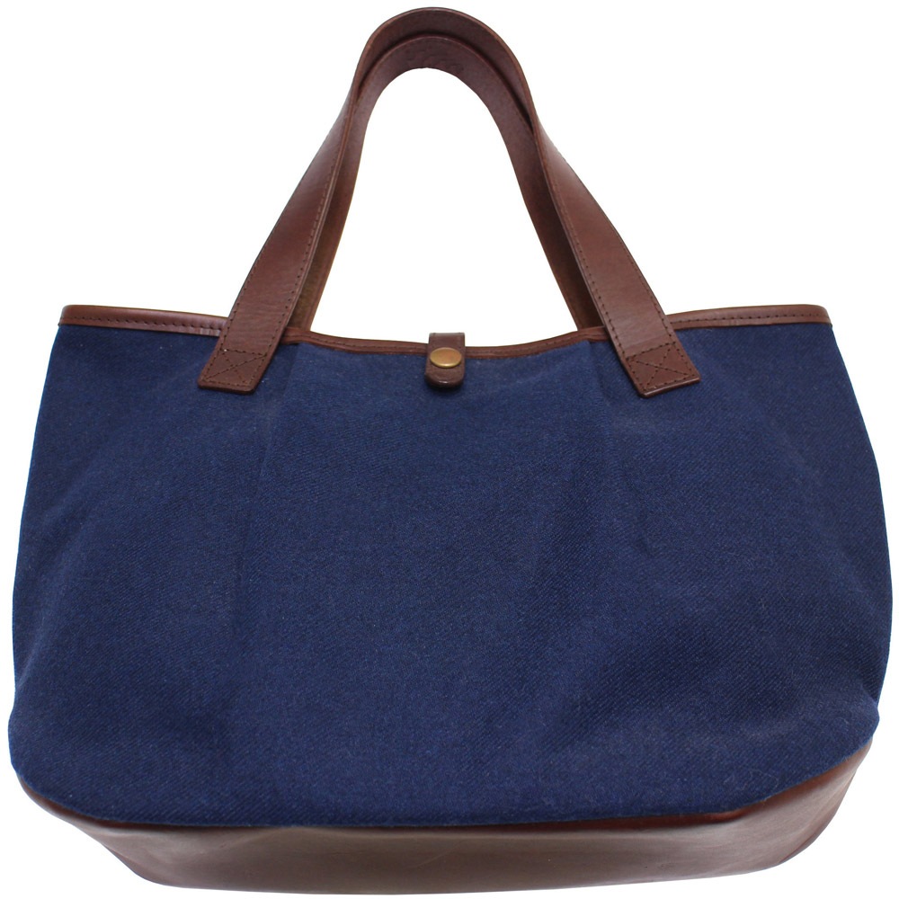 神戸のバッグブランド『Tandey』さんと、『デシネ』のコラボレーションが実現。『丸型トート』は、タンデイさんで人気の「丸型トート」をベースにしたアイテムですが、当店がフランスで買い付けたヴィンテージのファブリックを使用したコラボ作品です。コロンとした丸いシルエットが愛らしく、マチ付きで収納力もたっぷりで長財布も収納可能です。口が大きく開くので使いやすく、内部も見やすいのですが、ちゃんとスナップボタン付きです。丁寧な縫製、風合いの良いウール素材のネイビーと上質な革部分のダークブラウンのカラーリングが上品な印象です。上部のパイピングとボタン部分、持ち手、底にも上質な革を使用し、内側は帆布でポケットが2つ付いています。色にも細部にもこだわったクオリティの高い”純国産”の一品です。